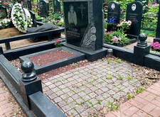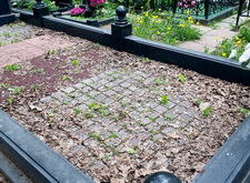 В данном случае клиент заказал нам полную уборку места захоронения. На могиле не убирались продолжительное время, поэтому территория участка была покрыта оставшимися с осени листьями. В цветнике, на земле, а также в швах между плитками брусчатки начала пробиваться сорная трава.